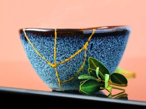 Kintsugi is the Japanese art of mending broken pottery by joining pieces back together and filling cracks with lacquer mixed with gold. It highlights the flaws in the repaired item. In our world today there seems to be no end to the broken pieces of our society and we are all a part of it in some way. But these pieces can be put back together again and be made stronger than before with work on our part. I am reminded of this when I look at Kintsugi. It turns into a beautiful piece of art.